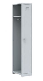 Дополнительная секция модульного ряда. В отделении: полка для головного убора, перекладина для вешалки и крючки для одежды, врезной замок. Шкаф может комплектоваться полками для обуви (в комплект не входят). Полимерное порошковое покрытие светло-серого цвета(RAL 7035).