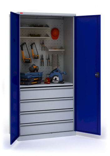 Инструментальный шкаф ИП-1/5 — вариант возможной комплектации (инструменты на фото в комплектацию не входят). К существующей комплектации можно добавить дополнительные элементы по желанию. Инструментальные шкафы оборудованы замком повышенной секретности и ригельной системой запирания. Варианты покрытия: СИНИЙ — Полимерное порошковое покрытие корпус светло-серого цвета (RAL 7035) двери синие (RAL 5002). ГРАФИТ — Полимерное порошковое покрытие корпус светло-серого цвета (RAL 7035) двери черные (Муар текстурная RAL 7021).