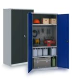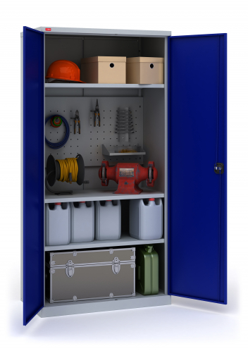 Инструментальный шкаф ИП-1/6 — вариант возможной комплектации (инструменты на фото в комплектацию не входят). К существующей комплектации можно добавить дополнительные элементы по желанию. Инструментальные шкафы оборудованы замком повышенной секретности и ригельной системой запирания. Варианты покрытия: СИНИЙ — Полимерное порошковое покрытие корпус светло-серого цвета (RAL 7035) двери синие (RAL 5002). ГРАФИТ — Полимерное порошковое покрытие корпус светло-серого цвета (RAL 7035) двери черные (Муар текстурная RAL 7021).