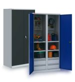 Инструментальный шкаф ИП-2/2 — вариант возможной комплектации (инструменты на фото в комплектацию не входят). К существующей комплектации можно добавить дополнительные элементы по желанию. Инструментальные шкафы оборудованы замком повышенной секретности и ригельной системой запирания. Варианты покрытия: СИНИЙ — Полимерное порошковое покрытие корпус светло-серого цвета (RAL 7035) двери синие (RAL 5002). ГРАФИТ — Полимерное порошковое покрытие корпус светло-серого цвета (RAL 7035) двери черные (Муар текстурная RAL 7021).