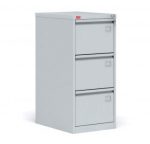 Металлическая сборно-разборная картотека, трехсекционная, с центральным замком, который закрывает все ящики. Используется для хранения документации в форматах Foolscap и А4. Имеет антиопрокидывающее устройство и телескопические направляющие. Полимерное порошковое покрытие светло-серого цвета (RAL 7035).