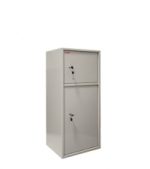 Шкаф представляет собой цельносварную металлическую конструкцию прямоугольной формы, соединение элементов которой выполнены методом сварки сплошным швом по контуру прилегания элементов. Корпус и дверь шкафа изготовлены из стального листа толщиной 1,2 мм. Дверь изнутри усилена панелью коробчатого сечения из стального листа толщиной 0,8 мм. В двери шкафа установлен врезной 8-ми сувальдный замок фирмы «ПРО САМ» (Россия). Горизонтальная перегородка делит шкаф на 2 независимых отделения, запираемых собственной дверью. В верхнем отделении шкафа КБС-042тн располагается отсек ограниченного доступа (трейзер), запираемый на замок «почтового» типа, а в нижнем – 1 съемная регулируемая по высоте полка. Петли шкафа – внутренние. Окраска — полимерное порошковое покрытие, цвет серый.