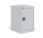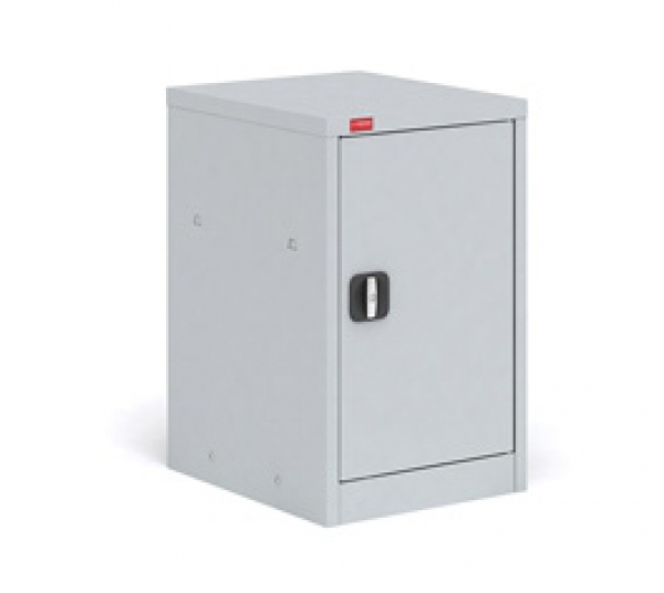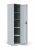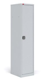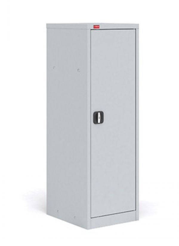 Шкаф разборный односекционный металлический. Имеет регулируемые по высоте полки, дверь шкафа оборудована замком повышенной секретности и ригельной системой запирания. Полимерное порошковое покрытие светло-серого цвета (RAL 7035).