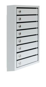 Металлический восьмихсекционный почтовый ящик ПМ-8, предназначен для сбора писем, газет, счетов и личной корреспонденции. Исполнение – вертикальное, поставляется в комплекте с замками. В почтовом ящике установлены фиксаторы дверей для предотвращения несанкционированного вскрытия ячейки. По задней стороне каждой ячейки имеется специальный загиб, высотой 30 мм, исключающий выпадение корреспонденции. Возможно комплектовать задней стенкой (в комплект не входит). Полимерное порошковое покрытие светло-серого цвета (RAL 7035).