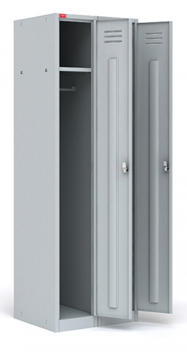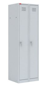 Основная секция модульного ряда. Шкаф состоит из двух боковых секций, это первая и последняя секции модульного ряда, между которыми можно вставить дополнительные секции. В каждом отделении: полка для головного убора, перекладина для вешалки и крючки для одежды, врезной замок. Шкаф может комплектоваться полками для обуви (в комплект не входят). Полимерное порошковое покрытие светло-серого цвета (RAL 7035).