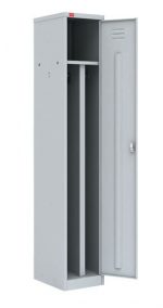 Шкаф разборный металлический односекционный с двумя отделениями, для хранения сменной одежды. Шкаф укомплектован врезным замком, полкой под головной убор, в отделении перекладина для вешалки и крючки для одежды. Полимерное порошковое покрытие светло-серого цвета (RAL 7035).