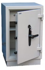 Внутри сейфа располагается отсек ограниченного доступа (трейзер), запираемый на замок «почтового» типа и одна съемная полка. В дне сейфа предусмотрено отверстие Ø11 мм для возможности анкерного крепления его к полу. Дверь сейфа оборудована запорным механизмом с 2-х сторонней ригельной системой запирания (по 3 ригеля Ø28 мм вправо/влево), который блокируется ключевым сейфовым замком класса «А» фирмы «CAWI» или «MAUER» производства Германии. Запорный механизм приводится в действие при помощи ручки. Чтобы открыть сейф необходимо: вставить ключ в замочную скважину, открыть замок и повернуть ручку на 90°. Закрывать в обратном порядке. Петли сейфа наружные, открывание двери – на 180°.