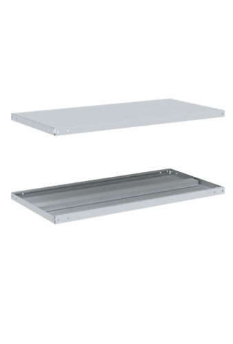 Полки являются одним из основных элементов металлического стеллажа. Установка полок по высоте произвольная — шаг отверстий для крепления полок составляет 25 мм. Стеллажные полки серии МС, изготовленны из высокопрочной стали специальной марки, позволяют выдерживать равномерно распределенную нагрузку до 150 кг. Для большего увеличения максимальной нагрузки возможна установка дополнительных ребер жесткости. Ребро жесткости вставляется в продольные загибы полки и позволяет увеличить равномерно распределенную нагрузку на полку до 180 кг. Полимерное порошковое покрытие светло-серого цвета (RAL 7035).