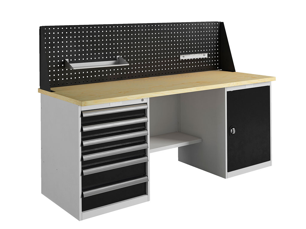 - Дополнительно верстак можно укомплектовать перфорированным экраном соответствующего размера, светодиодным освещением и аксессуарами для инструментов