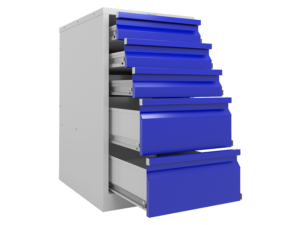 - Верстак состоит из 2 тумб WD5. Тумба укомплектована 5-ю выдвижными ящиками. Ящики открываются на телескопических направляющих. Нагрузка на ящик 30 кг. Все ящики закрываются на центральный ключевой замок.
