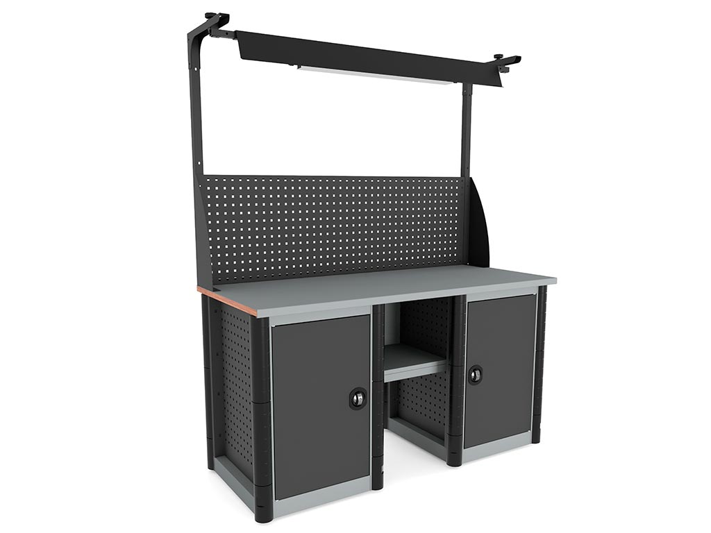 - Боковые перфорированные стенки тумбы и опоры позволяют размещать на них различные стандартные аксессуары