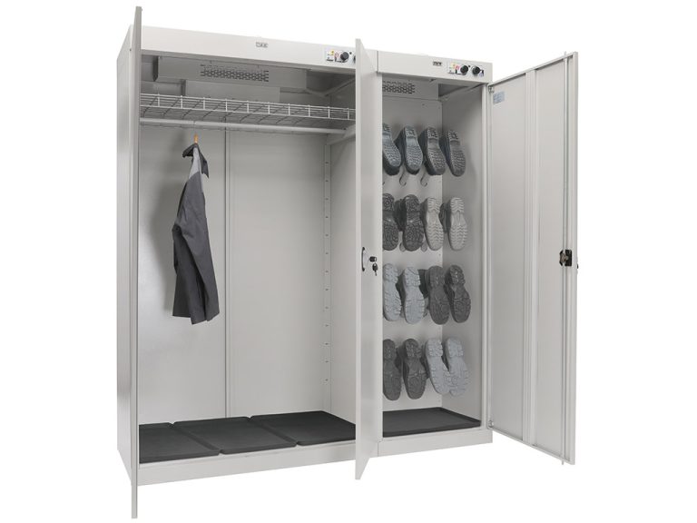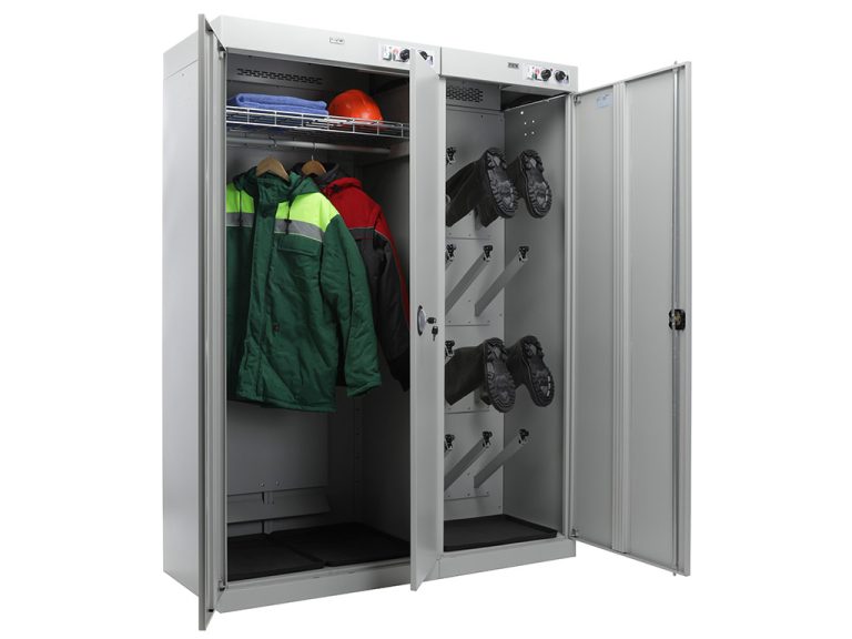 - шкаф состоит из двух независимых секций. Первая двухдверная для одежды, с перекладиной для вешалок и полкой. Вторая — для сушки обуви, оборудована патрубками для развешивания